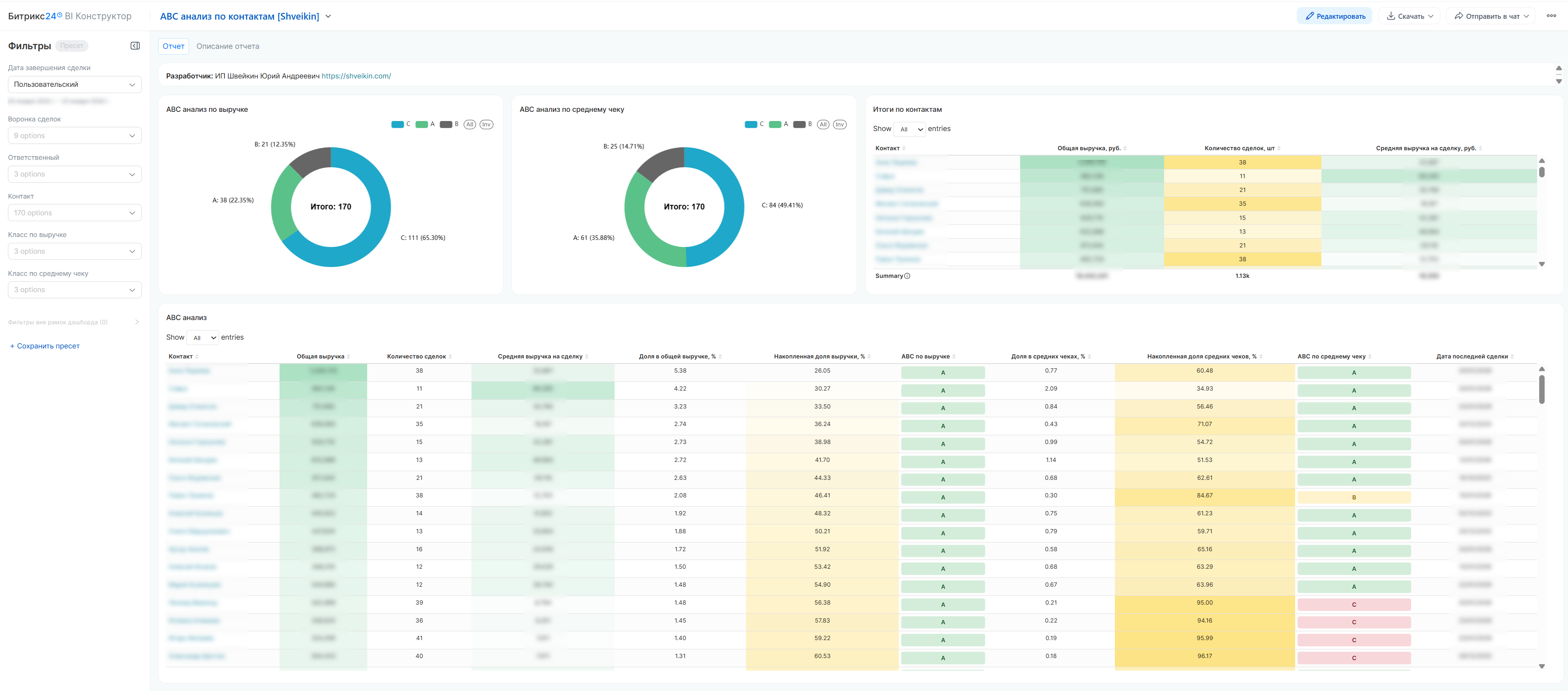 Доля в общей выручке – (выручка контакта / общая выручка всех контактов) × 100%.